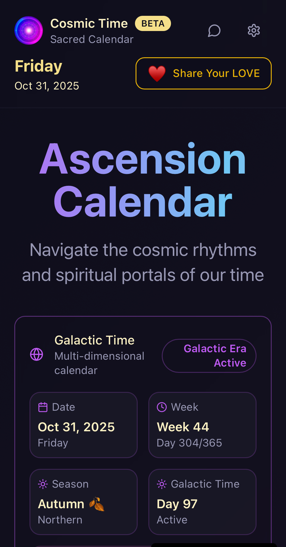 Kuidas äpp töötab ja mida sa sealt saad leida? Sa saad liikuda kalendris ajas edasi-tagasi ja sellega koos liiguvad ka kõik teised kalendrid, Kuu faasid ja Planeetide seisud. see annab meile võimaluse ette valmistumiseks ja toimunu analüüsiks. Otse ajas ja liikumisele ei allu Daili Insights e Tänasega seotud info, Solar Activity e. Päikese aktiivsus ja Earth Events e. Maa sündmused, mis on meile just Siin&Praegu info jagamiseks, et me saaksime paremini õppida lugema oma kehamasina tundeid, mis hetkel meie Planeediga toimuvaga ja seega ka otseselt meiega seotud. Kalendris on erinevate värvidega tähistatud Kuu loomise ja TäisKuu päevad, samuti Portaali päevad ja Varjutuste koridorid. Kohe alguses on sul ülevaade hetkest ajas kus viibime. Äpi üleval päises on ka Settingute e. Seadete nupp⚙️ , kus saab muuta ajavöödet, mis muidu kajastab kõigile üle kalendri neutraalset UTC TimeZone aega.Põnevat avastamist sulle 🤗